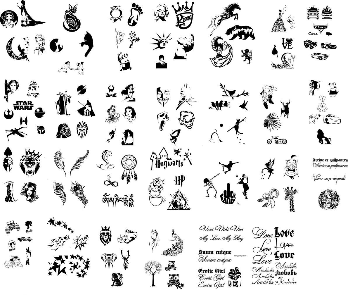 Новый профессиональный набор трафаретов для аэротату и блеск тату на жесткой самоклеящейся виниловой пленке многоразового использования. Набор разработан в 2020 году и ежегодно дополняется в соответствии с обратной связью от работающих тату мастеров по всей России.