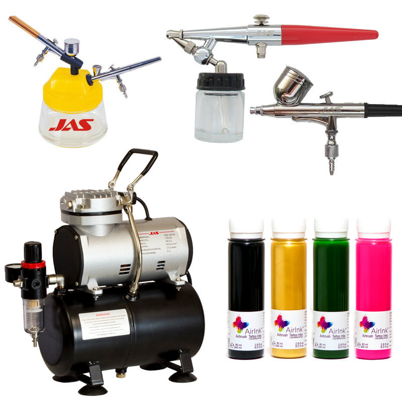 - Два аэрографа двойного действия фирмы Jas 1113 (с верхней подачей, по умолчанию) или Jas 1110 (с нижней подачей, по запросу)