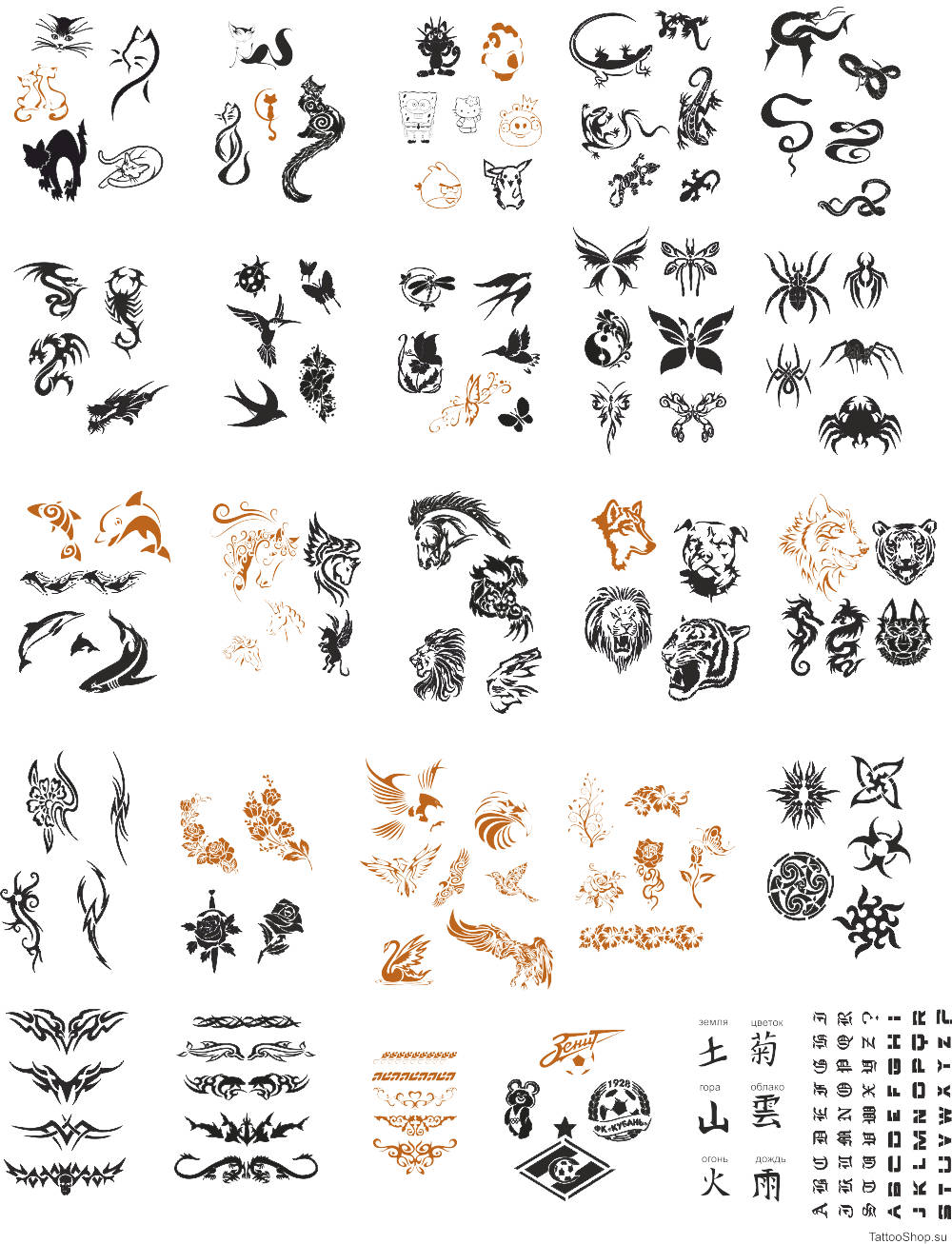 Состоит из 125 рисунков малого, среднего и большого размеров (от 3 см до 14 см) популярной тематики: драконы, пауки, змеи животные, цветы, бабочки, черепа, узоры на поясницу и плечо, герои мультфильмов, иероглифы.